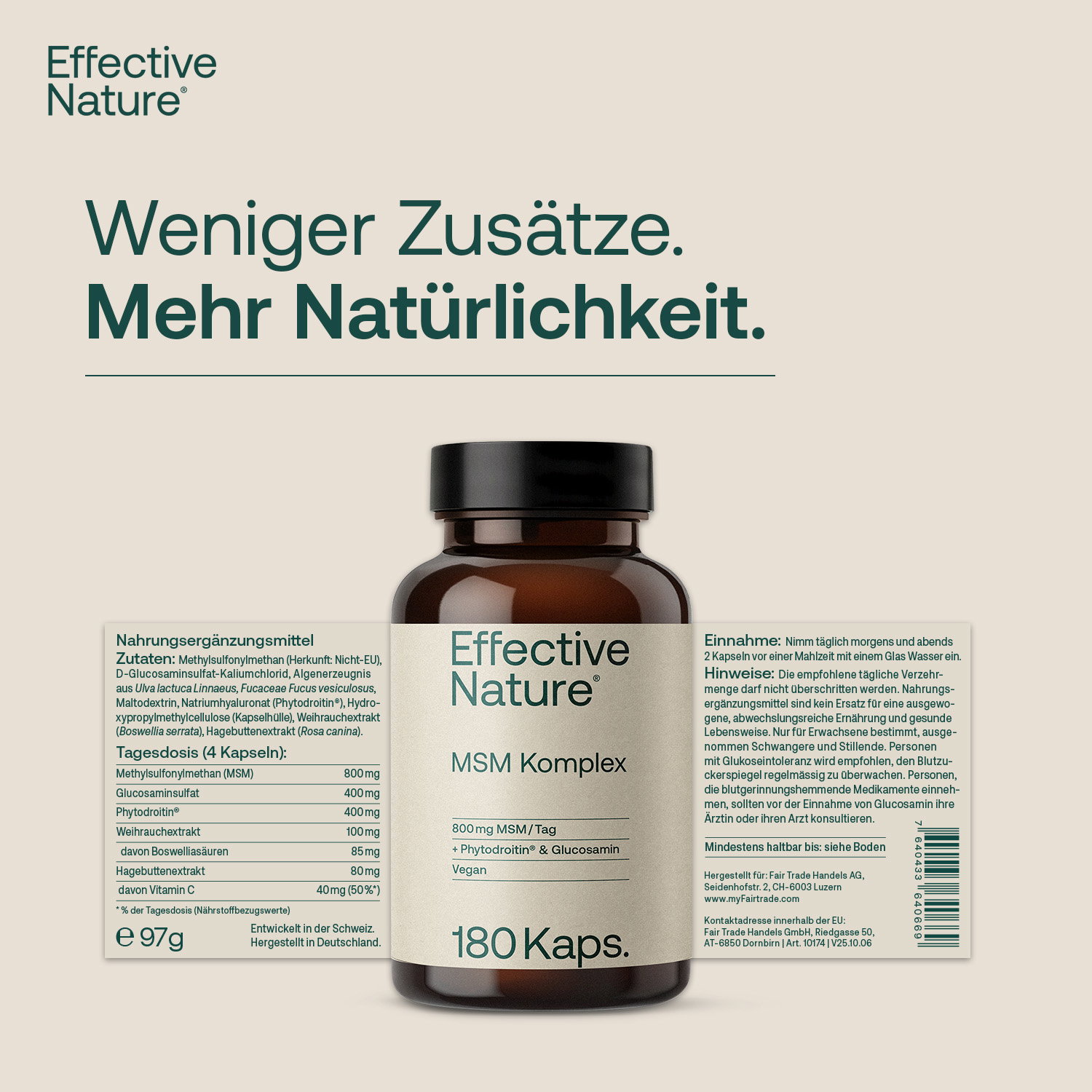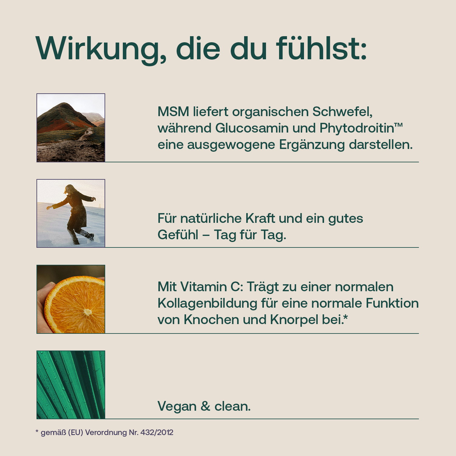 Pflanzlich abgerundet wird der MSM Komplex durch Extrakt aus dem Indischen Weihrauch (Boswellia serrata) sowie durch Hagebuttenextrakt (Rosa canina). Letzterer ist eine hervorragende Quelle für den essentiellen Nährstoff Vitamin C, das unter anderem eine normale Kollagenbildung für eine normale Knorpelfunktion unterstützt. Gemeinsam mit dem aus dem Ayurveda kaum wegzudenkenden Weihrauchextrakt (hier standardisiert auf 85% Boswelliasäuren) sorgt er für eine durchdachte und ideale pflanzliche Ergänzung des MSM Komplex