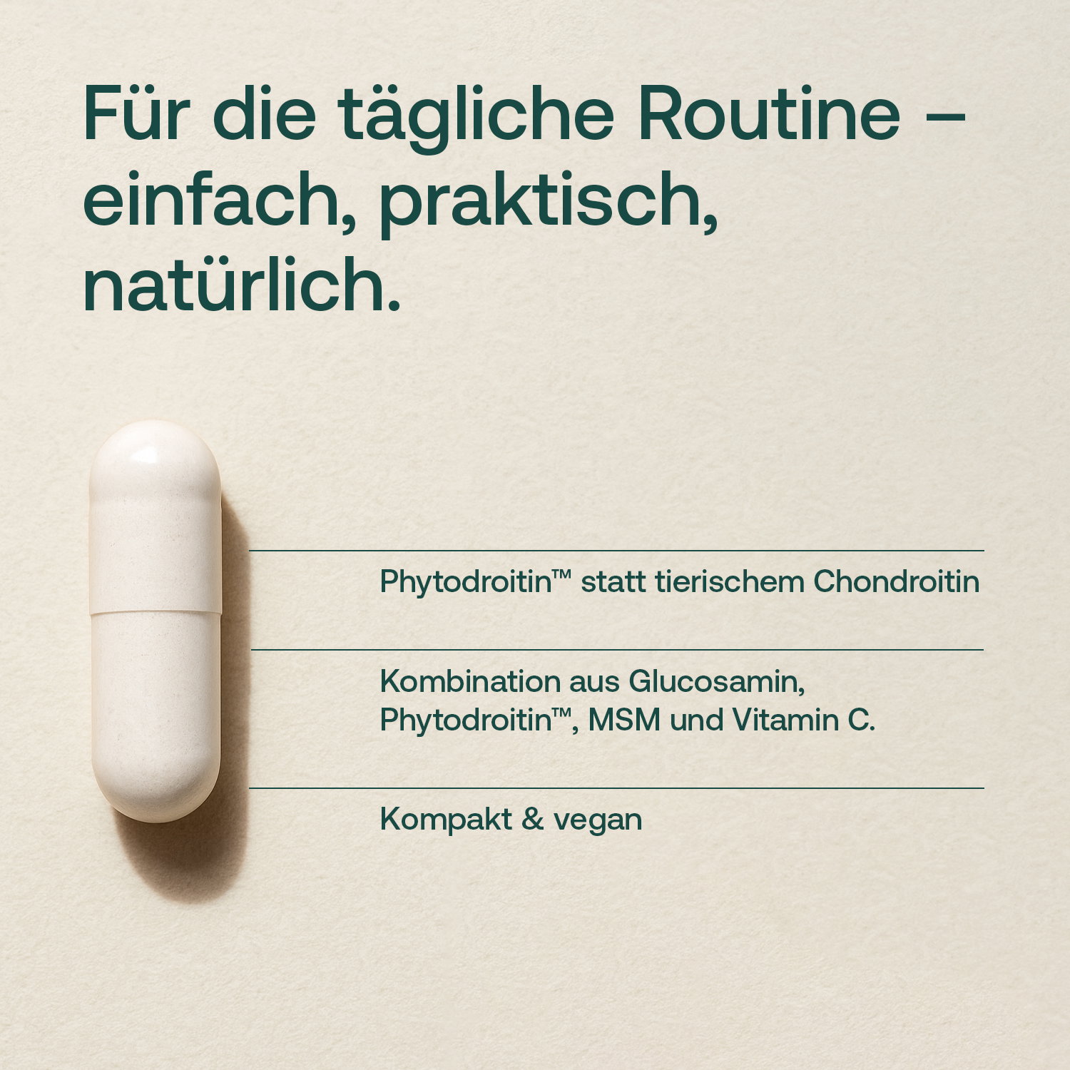 Enthalten sind Glucosamin sowie Phytodroitin™, eine vegane Alternative zu Chondroitin. Beide Substanzen sind Bestandteile natürlicher Strukturen des Körpers, darunter auch des Gelenkknorpels. Ergänzt wird die Formel durch Weihrauchextrakt (Boswellia serrata) und Hagebuttenextrakt (Rosa canina). Hagebuttenextrakt ist eine natürliche Vitamin C-Quelle. Der Nährstoff unterstützt unter anderem eine normale Kollagenbildung und eine normale Knorpelfunktion.