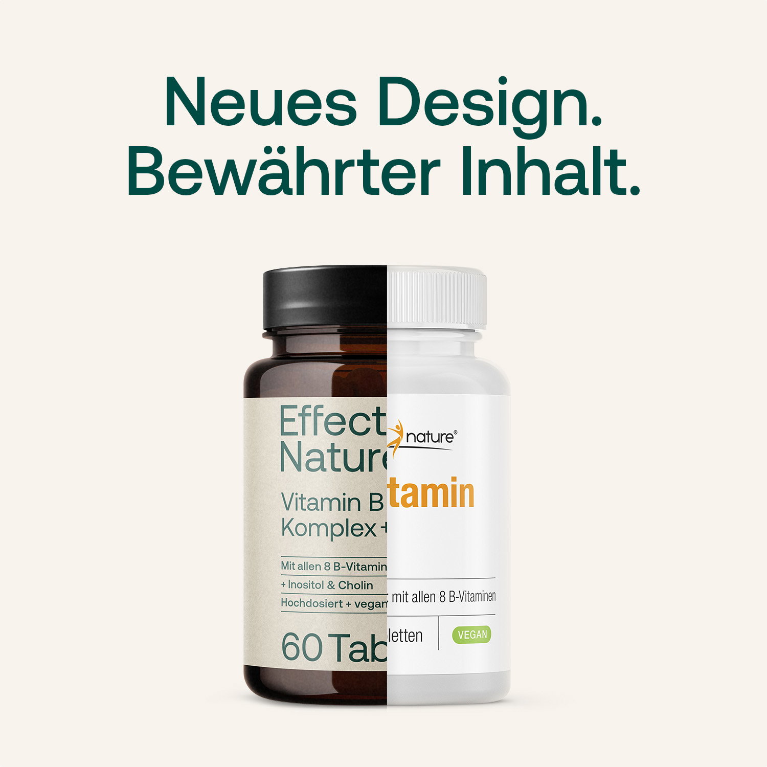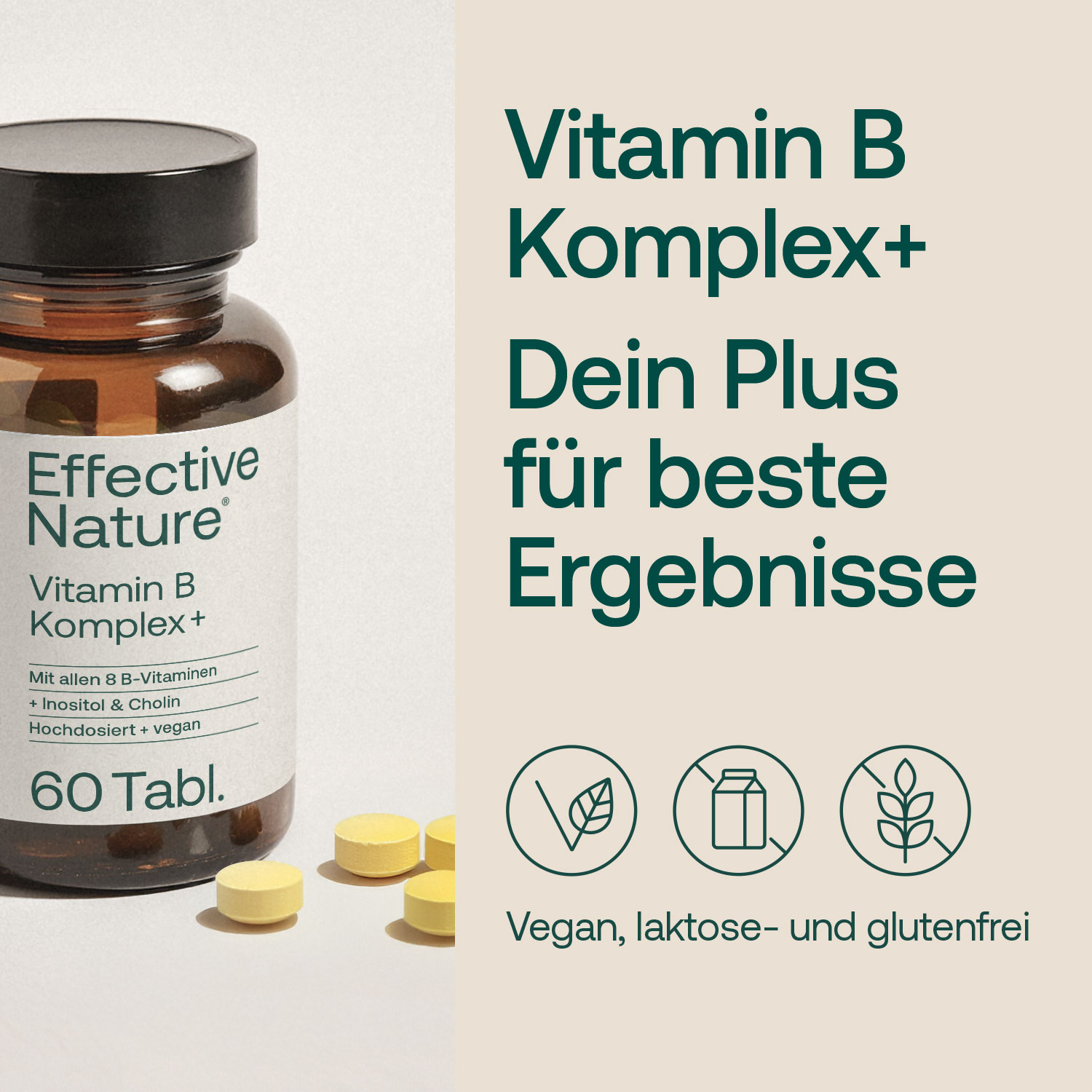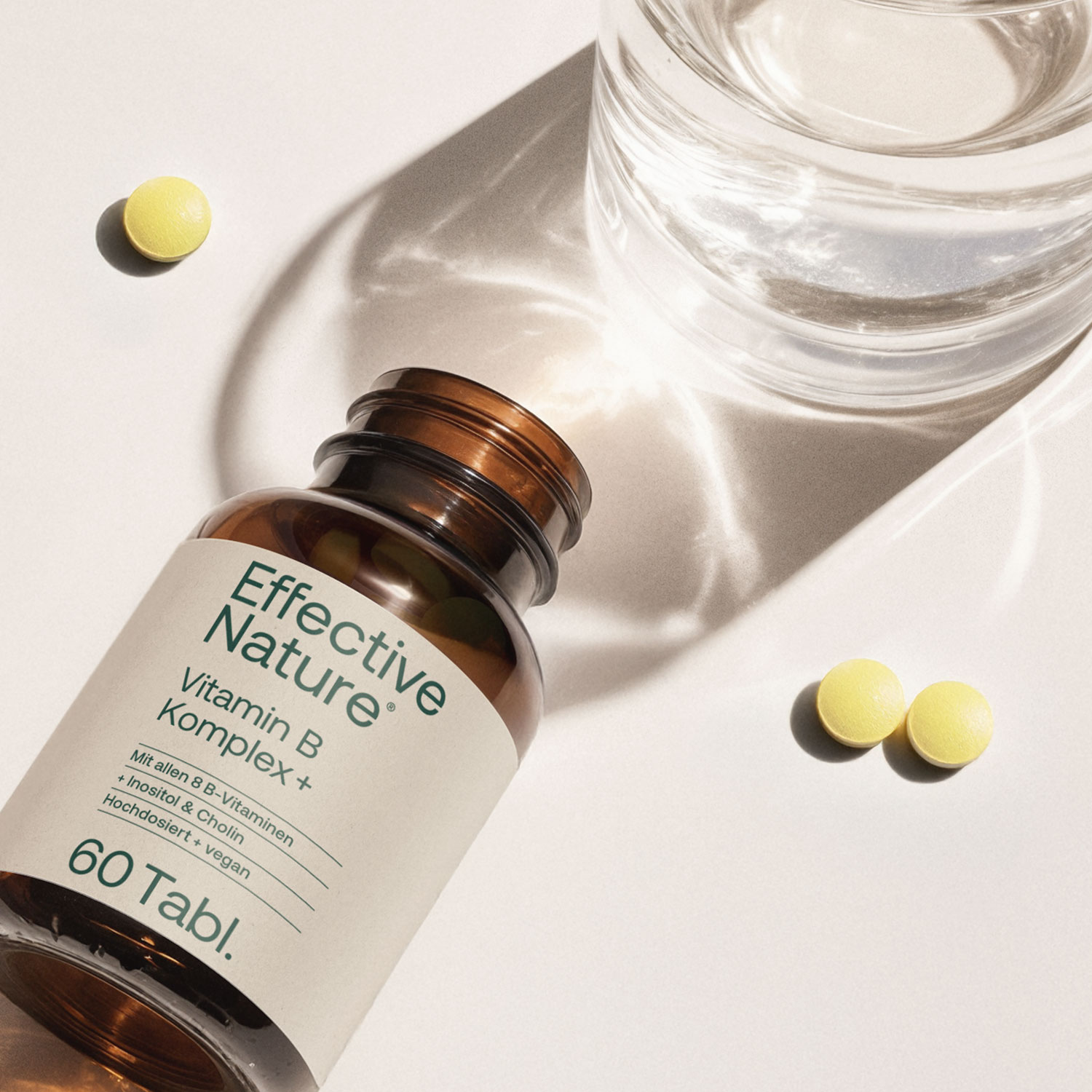 Mit dem Vitamin-B-Komplex von Effective Nature versorgst du dich rundum und hochdosiert mit allen acht essenziellen B-Vitaminen - in reiner Form, ohne unnötige Zusatzstoffe. Eine Tablette am Tag reicht, um deinen Bedarf an B1, B2, B3, B5, B6, aktivem Folat und Biotin zu mindestens 300% zu decken. Vitamin B12 ist sogar mit 1200% enthalten - in drei aktiven Formen, die für Vegetarier und Veganer ebenfalls sehr interessant sein dürften, da das Vitamin B12 in relevanten Mengen fast ausschliesslich in tierischen Lebensmitteln enthalten ist. Zusätzlich enthalten sind die beiden früheren B-Vitamine (heute als Vitaminoide bezeichnet) Cholin und Inositol. Diese vitaminähnlichen Substanzen gelten ebenfalls als essentiell, da der menschliche Organismus sie nicht selbst herstellen kann. Im Körper übernehmen sie den Vitaminen nicht unähnlich, verschiedene Aufgaben. Cholin bspw. unterstützt eine normale Funktion der Leber.