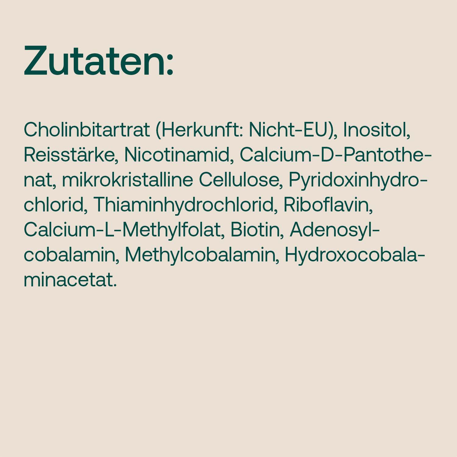Antwort vom 27.01.2026Cholinbitartrat (Herkunft: Nicht EU), Inositol, Reisstärke, Nicotinamid (Vitamin B3), Calcium-D-Pantothenat (Vitamin B5), Mikrokristalline Cellulose, Pyridoxinhydrochlorid (Vitamin B6), Thiaminhydrochlorid (Vitamin B1), Riboflavin (Vitamin B2), Calcium-L-Methylfolat (Vitamin B9), Biotin (Vitamin B7), Adenosylcobalamin (Vitamin B12), Methylcobalamin (Vitamin B12), Hydroxocobalaminacetat (Vitamin B12)