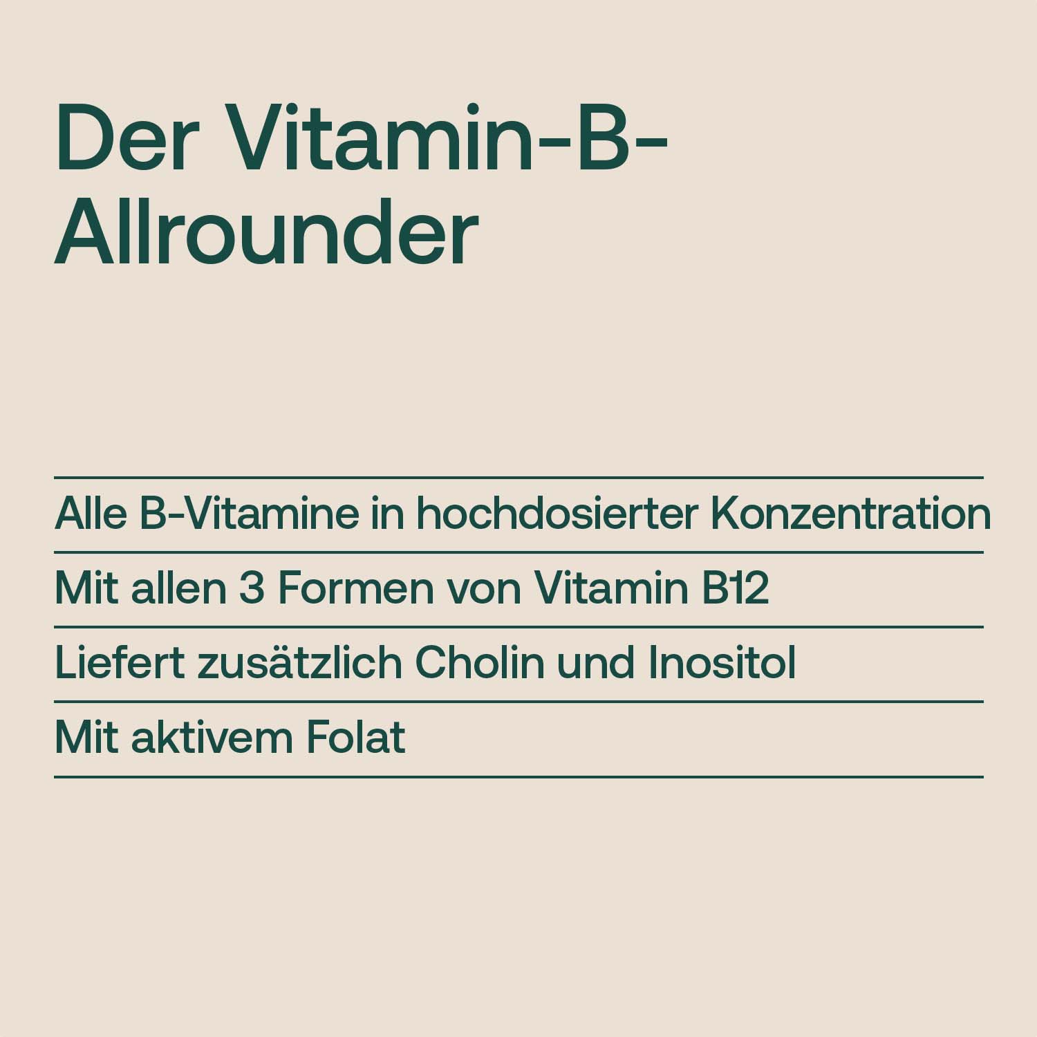 Zusätzlich zu den acht B-Vitaminen sind auch zwei Vitaminoide enthalten, das heisst vitaminähnliche Substanzen: Cholin & Inositol. Diese beiden sog. nicht-essentiellen Stoffe können, ähnlich wie das Vitamin D, zum Teil synthetisiert werden.